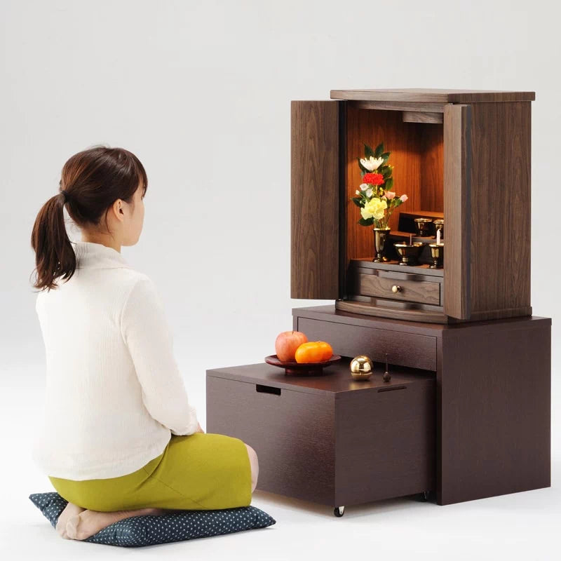 • 上置き仏壇の設置例です。キャスター付きの経机としてお使い頂けます。またお盆の時期にはお盆飾りなどをしていただくことも可能です。(画像はダークブラウン使用)