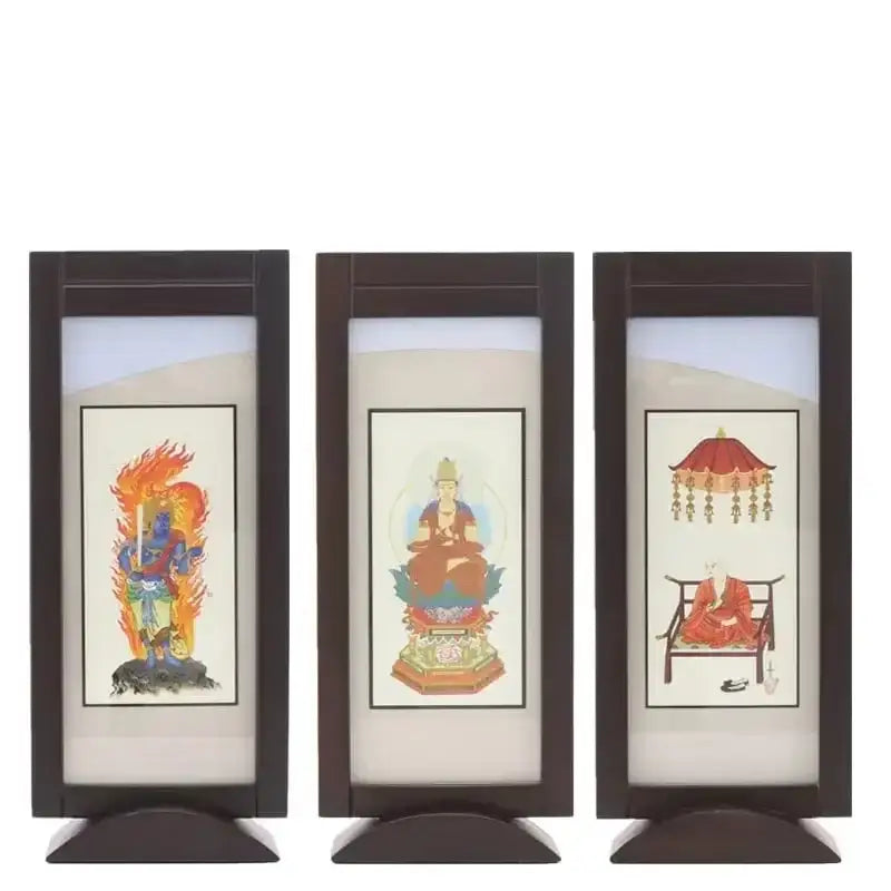 モダン仏壇・家具調仏壇によくマッチするスタンド型の掛け軸タイプの御本尊・脇侍です。「自立式のスタンド掛け軸」は従来型の「吊り下げ型の掛け軸」に比べ、掛軸立てを用意する必要がないのでラクラクです。掛け軸の表面はガラス板の為、水拭きも可能です。吊り下げ型の掛け軸と比べると経年が経過してもずっと綺麗な状態を保ちます。
