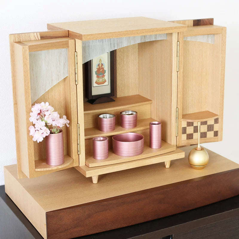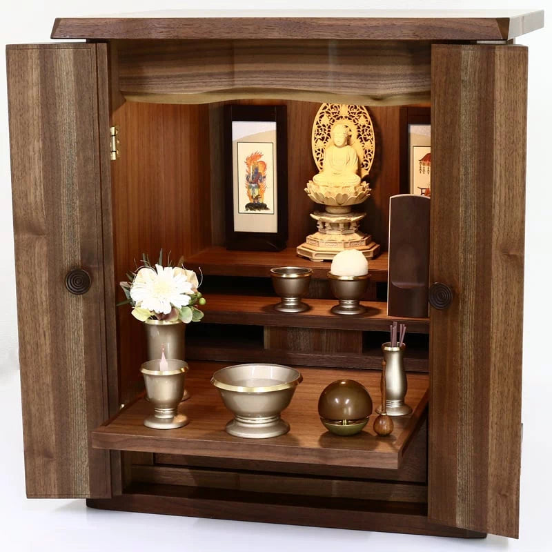 木材は強さとしなやかさを兼ね備えてた「タモ材」という木材を使用して作られております。元々明るい色合いの木材ですがウォールナット色に着色し、濃い色合いに仕上げております。濃いお仏壇はもちろんマッチしますし、明るいお仏壇に飾るとアクセントとして際立ちます。