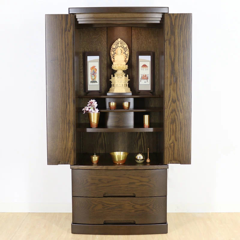 木材は強さとしなやかさを兼ね備えてた「タモ材」という木材を使用して作られております。元々明るい色合いの木材ですがウォールナット色に着色し、濃い色合いに仕上げております。濃いお仏壇はもちろんマッチしますし、明るいお仏壇に飾るとアクセントとして際立ちます。