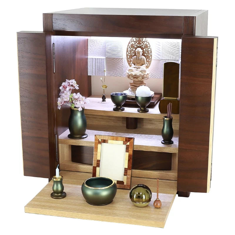 「優徳」は、伝統的な要素を残しながらも、洗練されたシルエットと落ち着いたカラーで、現代的な祈りの空間に自然と溶け込むよう設計されております。特にダークグリーンは深みを感じさせる色味で、お部屋全体の雰囲気を損なうことなく、心静かに手を合わせる空間を演出いたします。