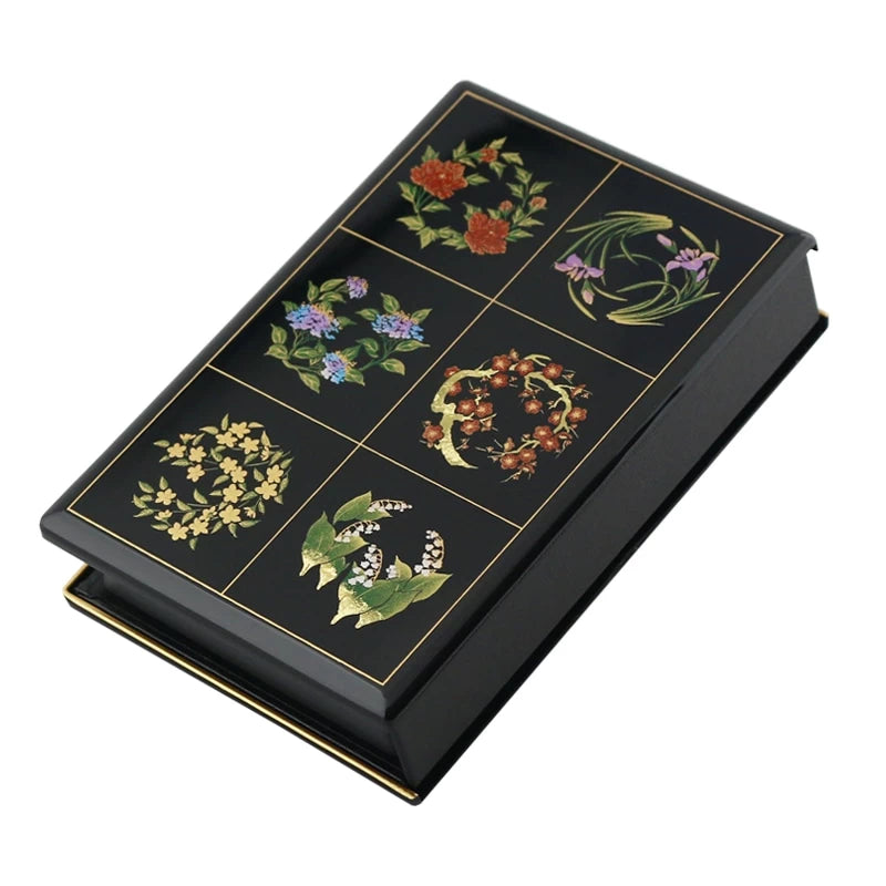 持ち運びも可能な携帯型位牌。6種類の花々を手書き蒔絵で描きました。和の雰囲気漂うデザイン。