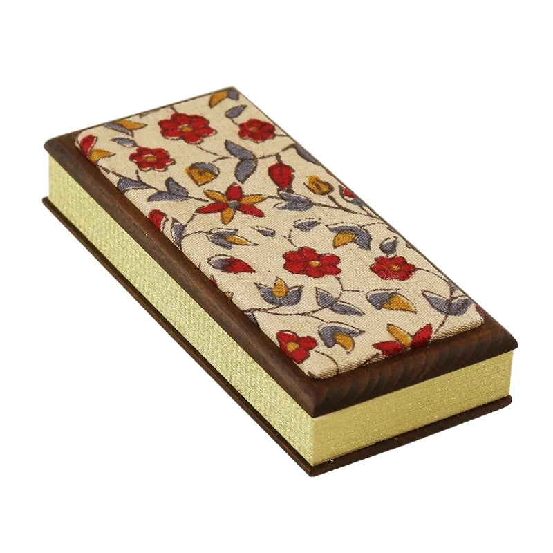 過去帳の外側にはタッサーシルクというシルクの中でも高級な種類の絹を使用。タッサーシルクはインド全域の森林地帯に産します。ただしその量は通常のシルクの50分の1 程度しか取れない高級なシルクです。一本一本の繊維が太く、また精練も途中で止めているので、かなり丈夫なシルクです。また木材は選定から乾燥・加工までとても長い時間をかけ、作られておりますので経年使用した際の木材の変形なども最小限に抑え、職人の技が光る国産の過去帳です。