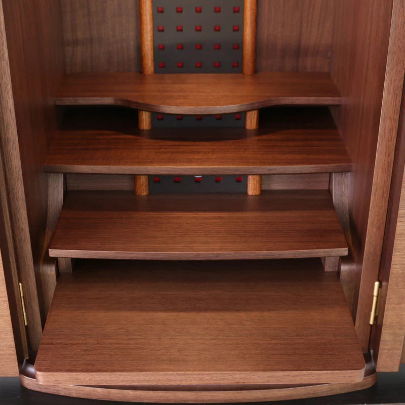 また素敵なデザインだけでなく普段の使いやすさにもこだわりました。特にお仏壇の内部段は仏具を乗せたまま手前にスライドすると内部段が合計4段になる為、仏具も広々飾れて、お位牌が多くなった場合にもしっかり対応できます。
