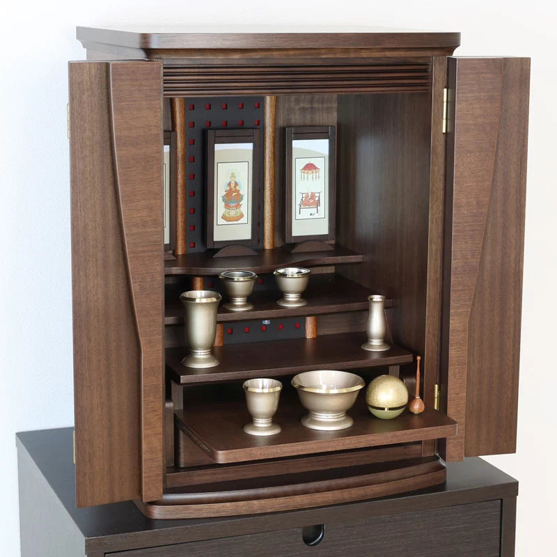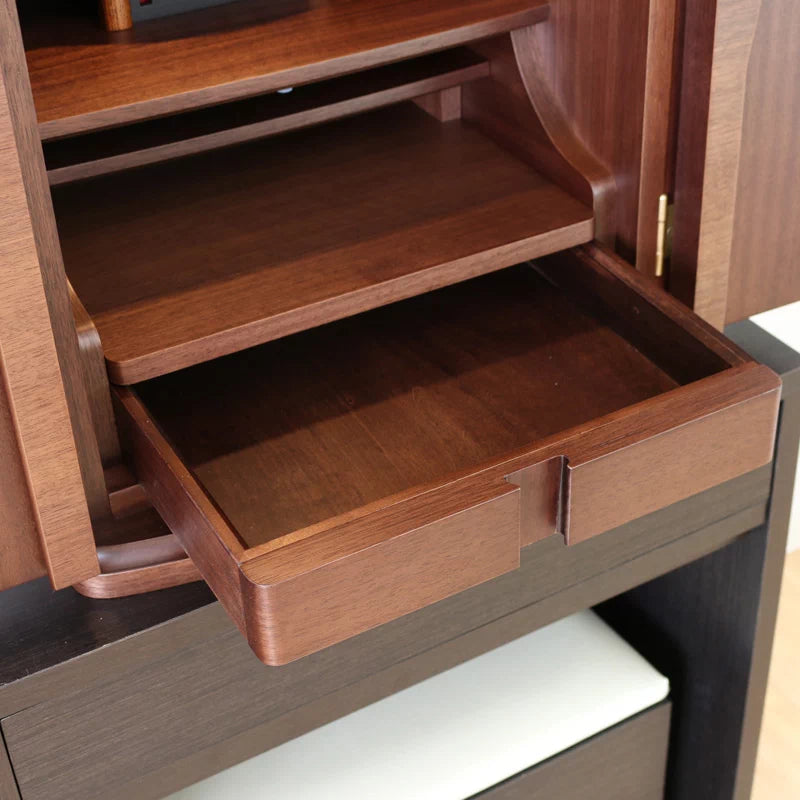 • 特 徴: LEDライト 、 スライド式内部段 、 引き出し収納 、 柾目の直線が多めの木目 、 セット仏壇の仏具シュミレーションあり 、 台の上に設置するタイプ