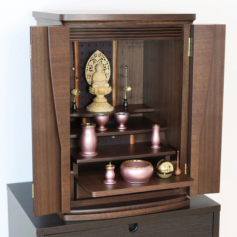 アクセント色としてピンク色の仏具を設置しました。ピンク色はウォールナットによくマッチします。ご本尊の脇のミニ常花はご本尊(仏像)を一層引き立てる仏具でお仏壇の中心とされる本尊をより一層荘厳します。