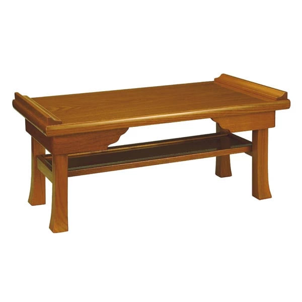本来は読経の際に経典をのせる机で、寺院本堂及び仏壇の前に置かれる仏具の一種、また仏具をお祀りするために使用する机です。経本を読み、写経を行うなどの用途より経机と呼称されておりますが、前香炉・線香立・リンなどを置いたり、飾り段としての使用することが多い仏具です。