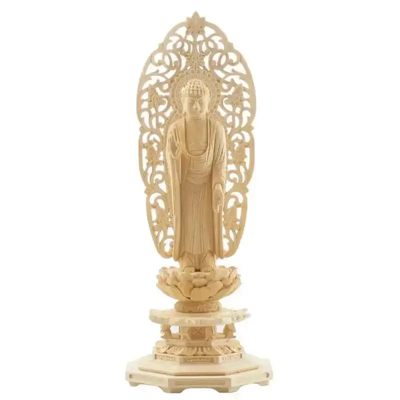 桧木材の上彫り仕上げの八角台座の舟立弥陀。浄土宗・時宗の仏壇用のご本尊様。