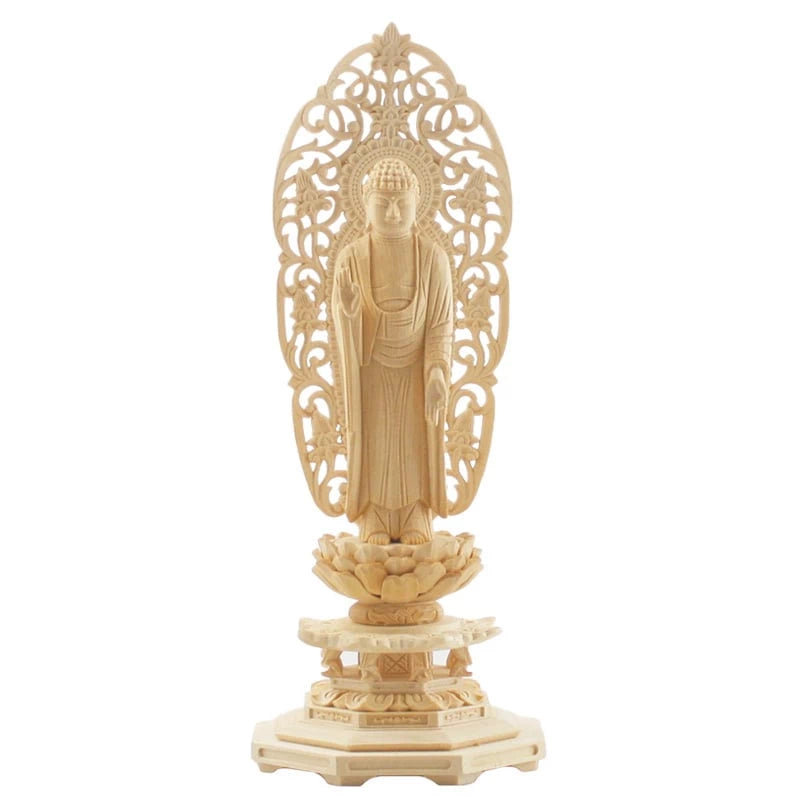 仏像の木材は馴染み深いヒノキ材を使用して一体一体、手彫りで彫られています。上彫り仕上げのとても細かい彫りです本柘植の仏像と比べますと重量感や彫りの細かさには劣りますが、美しい彫りはお値段以上の価値があります。桧木材の仏像は10年・20年と経年経過すると淡褐色になり、白檀や壇木などの仏像の色合いに近づき、重厚感が増していきます。