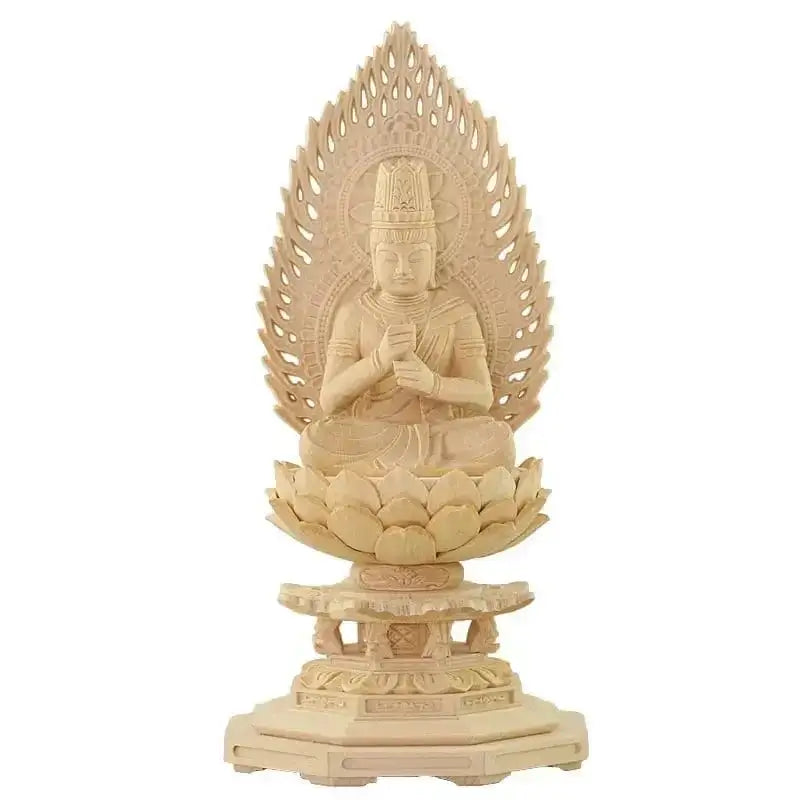 桧木材の上彫り仕上げの八角台座の大日如来。真言宗の仏壇用のご本尊様です。