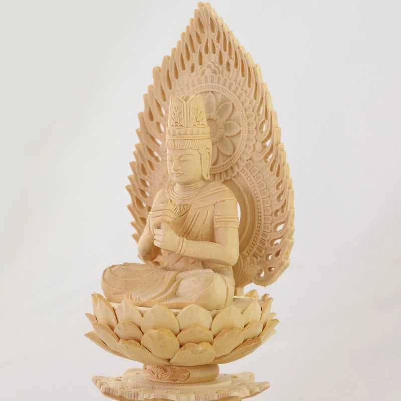 仏像の木材は馴染み深いヒノキ材を使用して一体一体、手彫りで彫られています。上彫り仕上げのとても細かい彫りです本柘植の仏像と比べますと重量感や彫りの細かさには劣りますが、美しい彫りはお値段以上の価値があります。桧木材の仏像は10年・20年と経年経過すると淡褐色になり、白檀や壇木などの仏像の色合いに近づき、重厚感が増していきます。