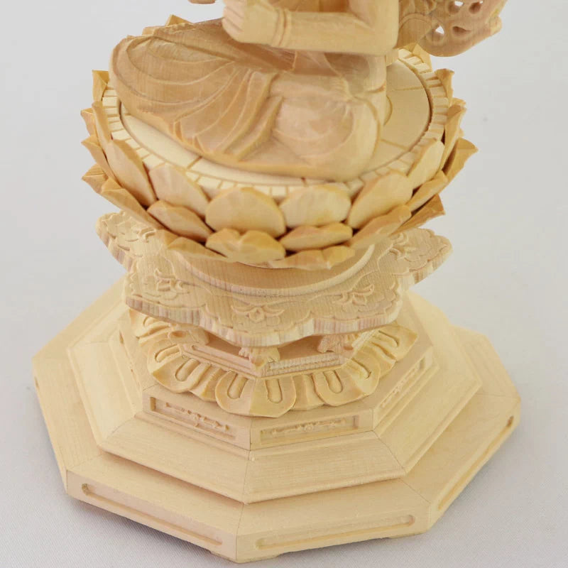 仏像の台座は八角台座という台座で彫りが細かいのが特徴。有名な寺院などのご本尊などを見るとそのほとんどが八角台座です。また八角台座は背の低い台座になりますので小型仏壇~中型仏壇までオススメの台座です。(大型のお仏壇には六角台座の仏像がオススメ)