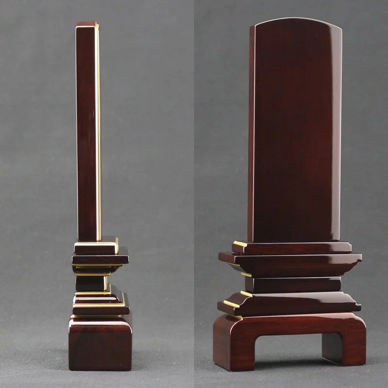 • 正面、正面斜めからのアングル。位牌の木材として最高級木材の紫檀、混合漆を用いて仕上げたお位牌です。