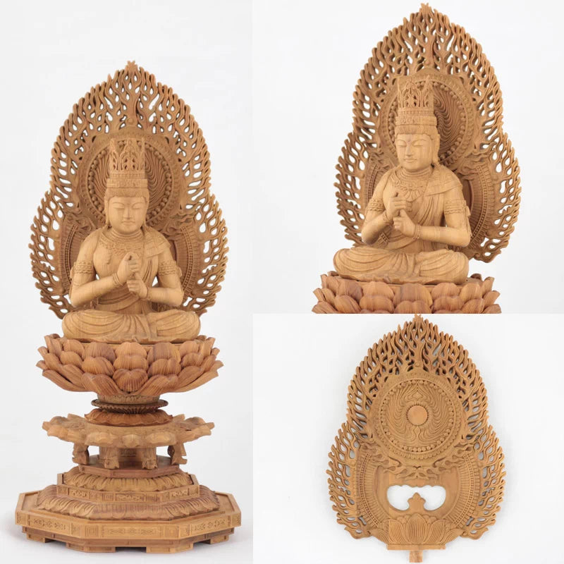 香木として知られる非常に希少な高級木材白檀を材質として使用し、紋様が緻密に彫られています。白木、柘植の仏像と比べて彫りが細かくなっています。白檀は耐久性に優れており、白檀特有の香りを感じられます。また、栽培が非常に困難な為、数が年々減少しています。真言宗でご使用いただけます。