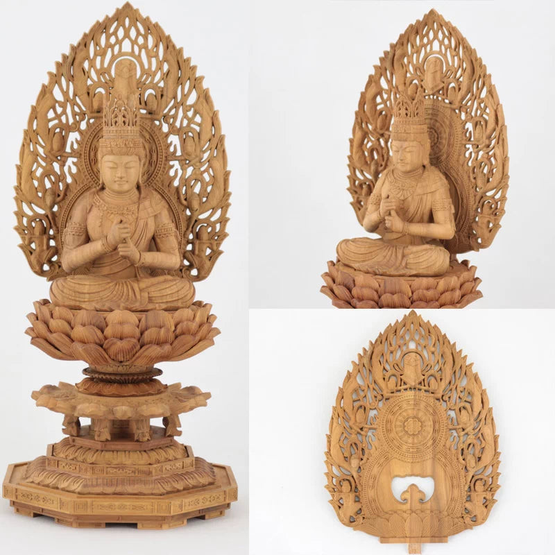 白檀仏像 八角台座 大日如来 【真言宗】:1.8寸 / 木地 / 飛天光背