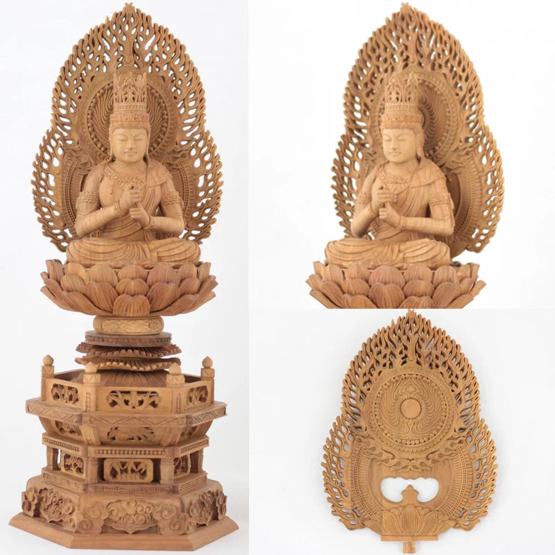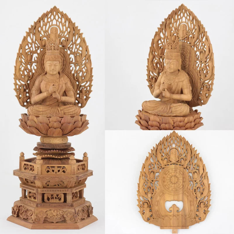 白檀仏像 六角台座 大日如来 【真言宗】:3.0寸 / 木地 / 飛天光背