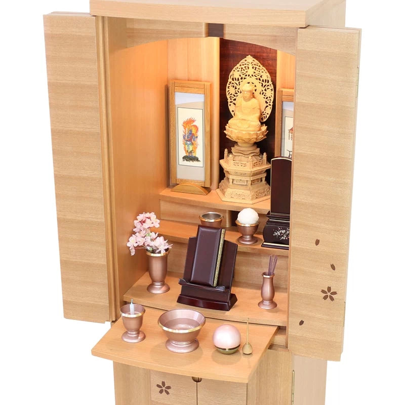 サクラ色の絶妙な中間色はお仏壇にとても合わせやすい特徴があります。濃い色合いのお仏壇も、明るいお仏壇にもとてもマッチし、ふんわり優しい印象になります。