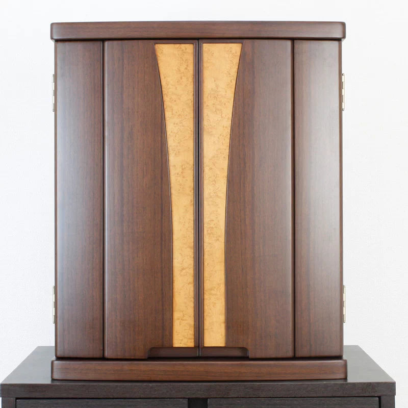 主木材には世界三大銘木のウォールナットとアクセントに希少なバーズアイメープルを使用し、いづれも高級木材を使用した本格仏壇です。お仏壇の色合いも置く場所を選ばないカラーですので和室・洋室問わず幅広い場所にマッチします。