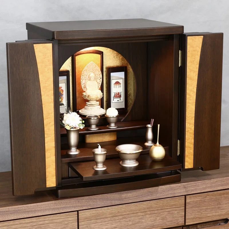 • 特 徴: 国産品 、 LEDライト 、 仏具板 、 引き出し収納 、 柾目の直線が多めの木目 、 セット仏壇の仏具シュミレーションあり 、 台の上に設置するタイプ