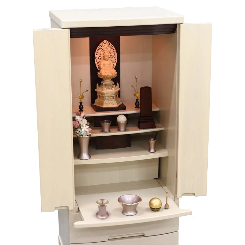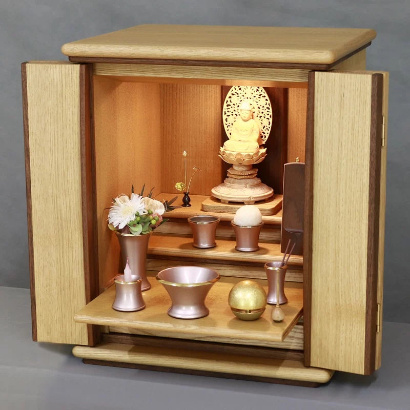現代の仏壇に合わせて作られたコンパクトでスマートな仏具です。スタイリッシュなフォルムは、さまざまなお仏壇やお位牌などとも調和します。お仏壇を艶やかな表面は美しく輝き、色合いは、上品な祈りの場を創り出します。各仏具の開口部の縁取りはゴールドで高級感と存在感を高めます。