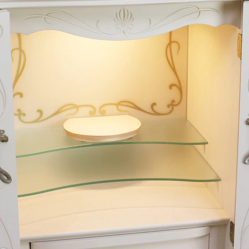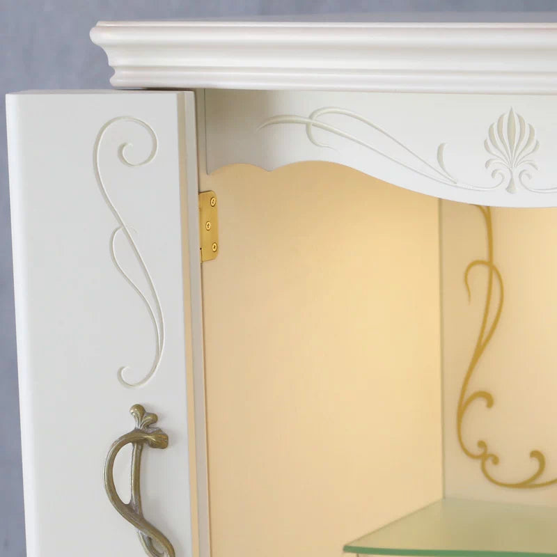 細かい彫刻は熟練のアンティーク家具職人にのみ許された非常に難易度の高い芸術品です。ホワイトの色合いは木目をつぶさないよう、なおかつ木目が出すぎないようなホワイトの微妙な吹き付け加減で職人技が光る塗装方法。ポイントに「アンティークゴールドパウダー」を吹き付けて仕上げています。この加工により古き良き時代の色合いを絶妙に再現しております。