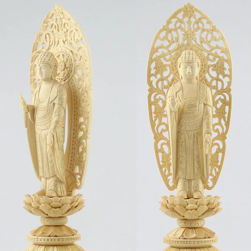 仏像は台座・光背・仏身(立像は手も外れます)が外れる様になっております。開眼供養などの際の持ち運びの際などはパーツを外して、購入時の箱に入れて持ち運ぶことをおすすめします。彫刻部分は落下などの衝撃などが加わると割れやかけてしまうことがあります。
