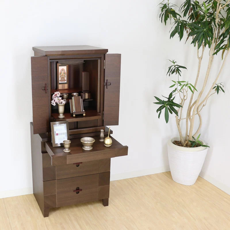 • 特 徴: 国産品 、 LEDライト 、 スライド式内部段 、 引き出し収納 、 柾目の直線が多めの木目 、 セット仏壇の仏具シュミレーションあり 、 台の上に設置するタイプ