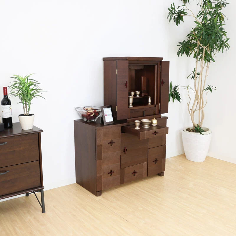 • 明るいリビングに「モダン仏壇台 アローズ ワイド ウォールナット」と組み合わせて設置しました。ワイドサイズですのでお仏壇の脇にちょっとした写真や御供えの花瓶などを飾ることも可能です。