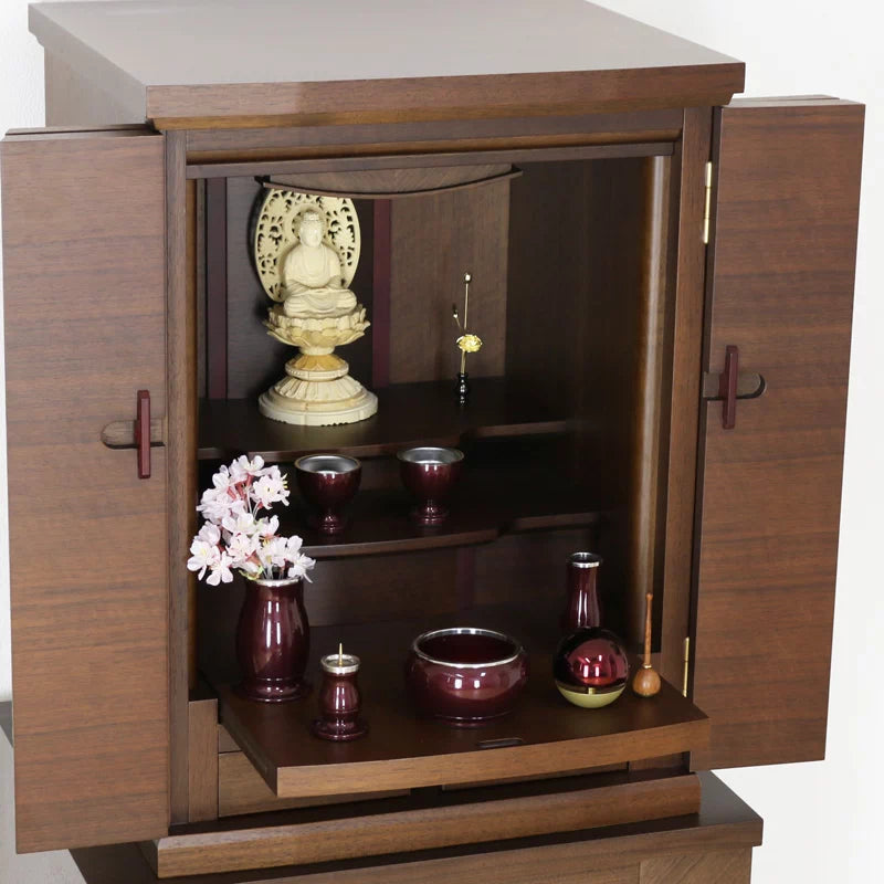 本尊には桧木製の仏像を飾りました。仏像の両脇のミニ常花は仏像を蓮花で引き立てるための仏具です。仏具にはお仏壇の取っ手や背板部分のワンポイントのワイン色に合わせてアルミムクのワイン色をお飾りしました。リンは仏具に合わせたまゆらリンのレッド色を組み合わせました。高い音色で余韻が長く響き渡ります。