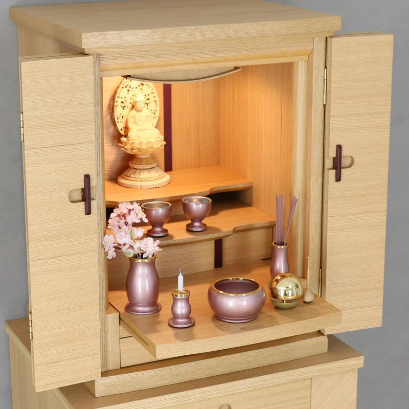 • 特 徴: 国産品 、 LEDライト・スライド式内部段・引き出し収納 、 柾目の直線が多めの木目 、 セット仏壇の仏具シュミレーションあり 、 台の上に設置するタイプ