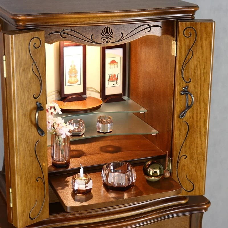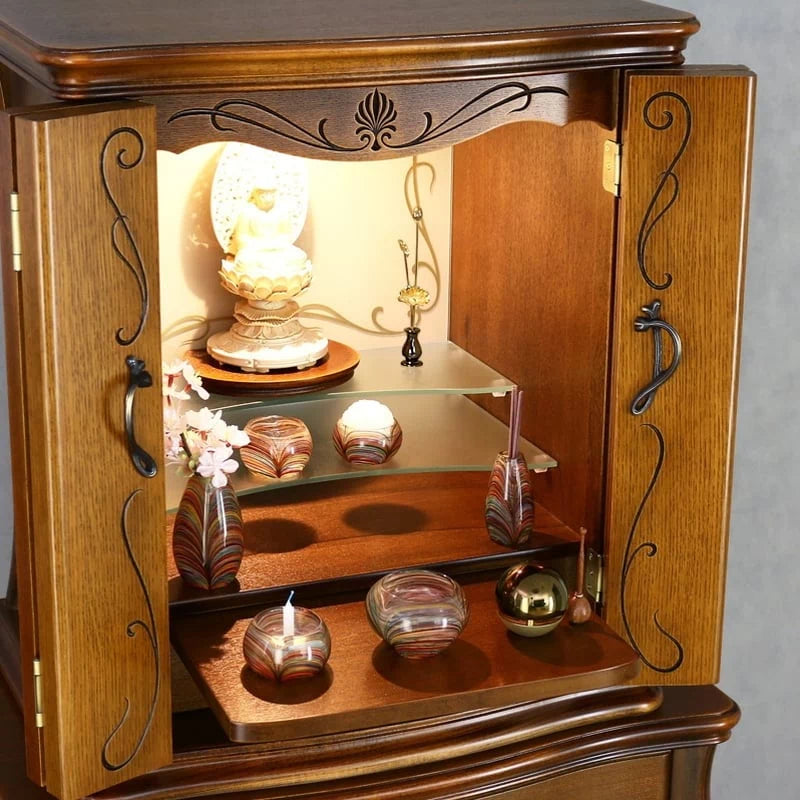 「ボヌール クラシック」は、上品なアンティーク調のデザインに加え、脚付きで空間に軽やかさを演出できるのが特長で、椅子もセットでお付けしておりますため、日々のお参りがしやすいとご好評いただいております。