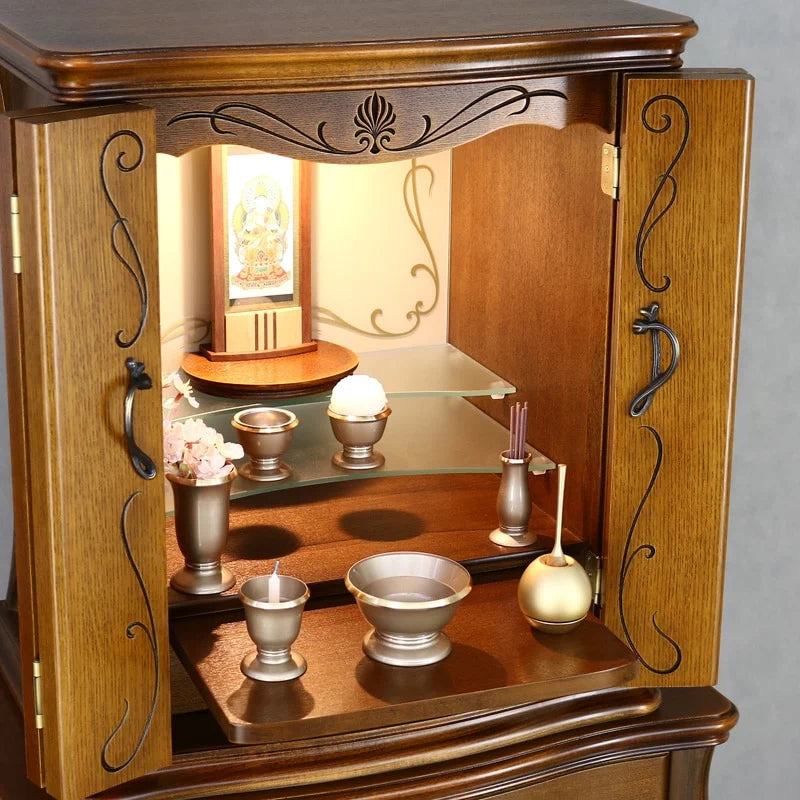 ヨーロッパのアンティークのデザインをモチーフに現在の匠の技と融合させた新しい祈り空間。テーマは「ヨーロピアン クラシック デザイン」アンティーク家具専門の家具メーカーが作り上げたお仏壇で、手の込んだ細かい彫刻、アンティーク加工を施した金具、曲線ラインを生かしたフォルムなど、職人のこだわりが極上の祈り空間を生み出しました。